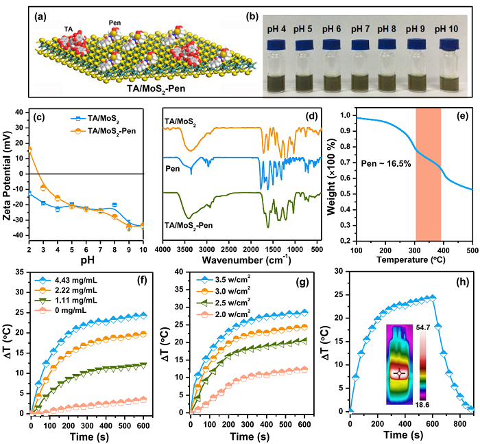 h)MoS2-Pen溶液在NIR激光(3W/cm2)照射下的光热效应。照射10分钟后关闭激光。MoS2-Pen的浓度为4.43mg/mL。插图:照射10分钟时MoS2-Pen溶液的红外热图像。