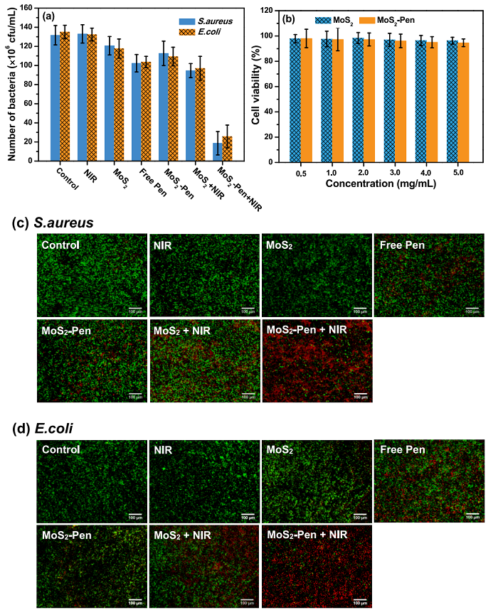a)在添加不同抗菌剂时的金黄色葡萄球菌和大肠杆菌的数量:对照,NIR光,MoS2纳米片,游离Pen,MoS2-Pen纳米片,具有近红外光的MoS2纳米片和MoS2-Pen纳米片;