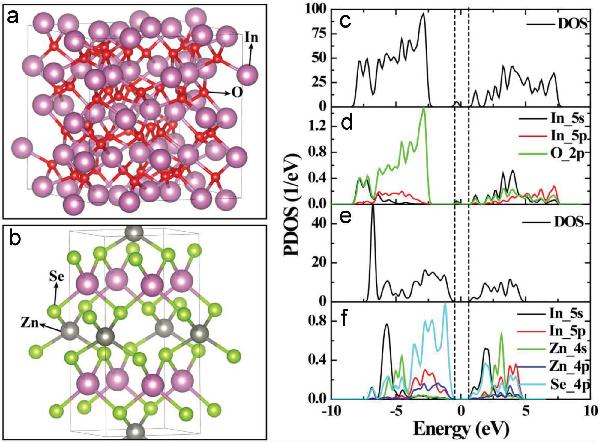 c-f) In2O3和ZnIn2Se4相应的态密度(DOS)图,其中虚线表示费米能级。