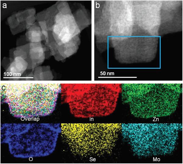 a, b) In2O3-ZISe-Mo Z型纳米片的STEM图像;