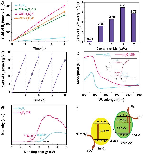 作者从理论和实验上证明了一类新型自发Z型In2O3-ZISe光催化体系。当Mo原子以Mo—Se键的形式进一步掺入In2O3-ZISe Z型纳米片时,所得In2O3-ZISe-Mo纳米片可整合Z型催化剂和助催化剂的优势,相比In2O3-ZISe和In2O3纳米片(分别为319.7和29.9 μmol·h-1·g-1)具有更高的制氢速率(6.95 mmol·h-1·g-1)。在16 h测试后制氢活性几乎没有降低,具有较高的光催化稳定性。 In2O3-ZISe-Mo纳米片的紫外-可见漫反射光谱显示其光吸收增强,其PL光谱、瞬态光电流和EIS显示其可促进光生载流子的分离和传输,这两者都是推动光催化制氢的关键。