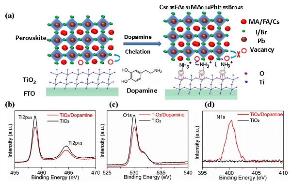 (a) 多巴胺交联钙钛矿/二氧化钛界面的结构示意图, (b)-(d)多巴胺包覆前后TiO2的XPS光谱。