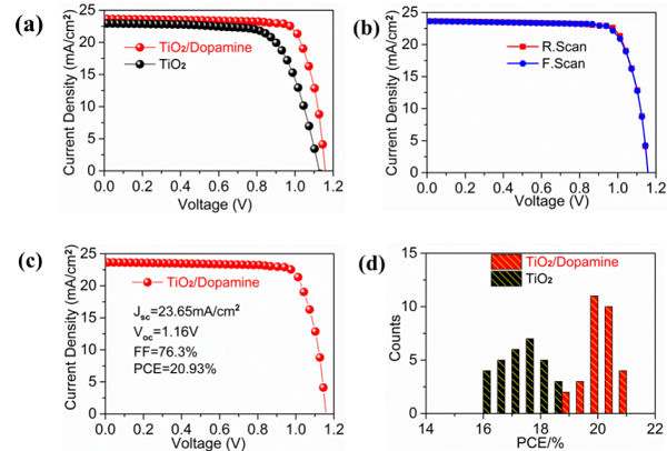 (a)多巴胺钝化前后TiO2的器件的J-V曲线;(b) 多巴胺钝化后的器件不同扫描方向的J-V曲线;(c)最好性能电池的J-V曲线;(d)效率分布统计。