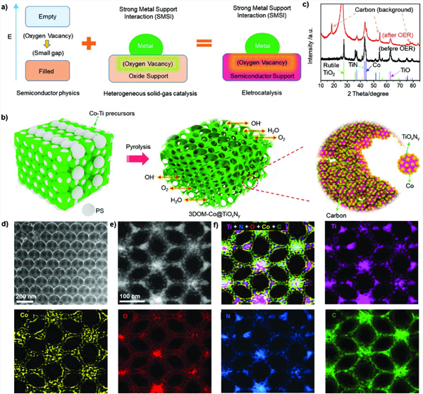 近日,在加拿大滑铁卢大学陈忠伟教授和河南师范大学白正宇副教授团队(共同通讯作者)带领下,与美国布鲁克海文国家实验室合作,论文第一作者为博士生刘桂华,基于氧空位(Oxygen vacancy,OV)在半导体物理中对电导率影响的认知及其在传统气-固非均相催化剂中提供的强金属-载体相互作用(strong metal-support interaction,SMSI)的理解,提出了一种以富、低带隙半导体为载体的超细过渡金属双功能催化剂设计新策略:OV促进了氧化物半导体载体的导电性,同时提供跟强的SMSI,这使得所制备的负载型金属催化剂具有极小的尺寸、极高催化活性和高稳定性。根据此催化剂设计策略,成功开发出了一种由3D有序大孔氮氧化钛(3DOM-Co@TiOxNy)负载的超细金属Co催化剂。在碱性条件下,3DOM-Co@TiOxNy表现出与贵金属催化剂相当的ORR和OER活性的同时,具有更高的循环稳定性。使用这种催化剂所制备的锌-空气电池,在20mA cm-2电流密度下的900次充放电循环中,能量效率损失低于1%。其优异的循环稳定性归因于Co和3DOM-TiOxNy之间的强SMSI,并通过密度泛函理论(DFT)计算得到了验证。该研究所提出的使用富含OV的半导体材料作为载体,同时利用OV提供的SMSI来设计高效、耐用的非贵金属电催化剂,开拓了一种全新的电化学催化剂设计思路。相关成果以题为“An Oxygen–Vacancy–Rich Semiconductor–Supported Bifunctional Catalyst for Efficient and Stable Zinc–Air Batteries”发表在了材料领域著名期刊Adv. Mater.上。