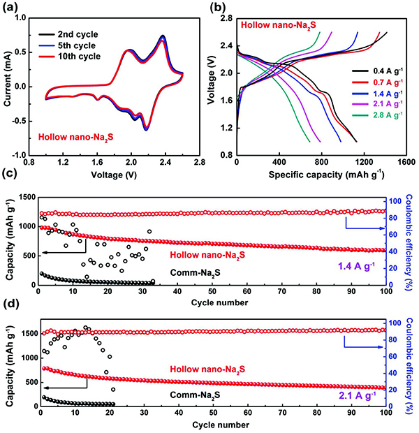 (c,d)中空纳米Na2S和商业-Na2S正极在不同电流密度下的循环性能和库仑效率对比