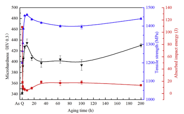 显微硬度、抗拉强度和冲击韧性随时效时间的变化曲线
