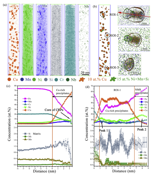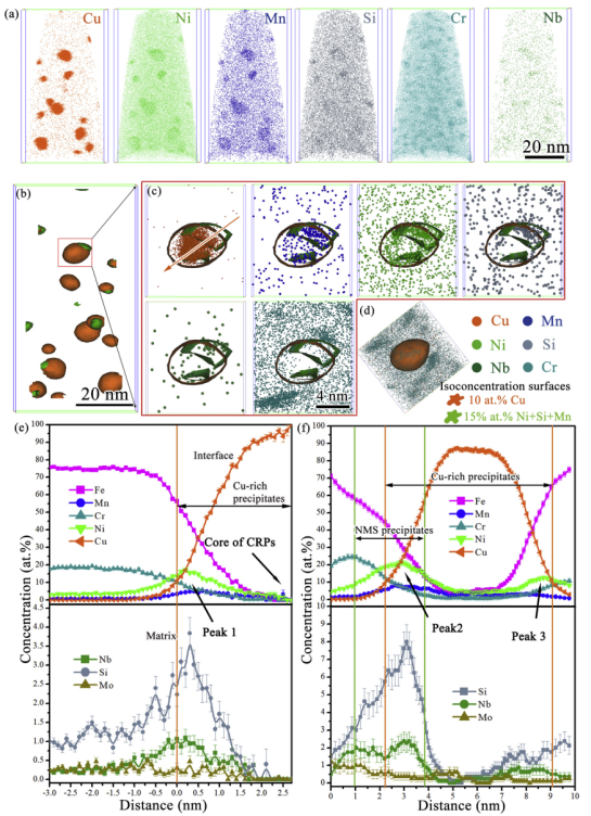 (a) Cu、Ni、Mn、Si、Cr和Nb空间分布;(b)10% Cu和15%Ni+Mn+Si等浓度面分布;(c) 富Cu相剖面成分分布;(d) 图c中富Cu相红色箭头方向原子一维浓度分布