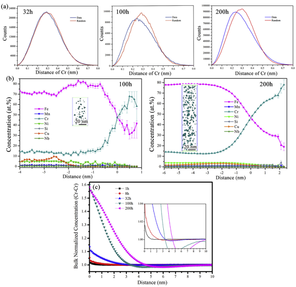 (a) 时效32h、100h和200h,Cr的NND统计;(b) 45%Cr等浓度分布以及剖面分成分布;(c) 富Cr区的“振幅”和“波长”统计