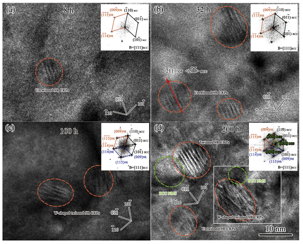 (2) 多元纳米相的析出演变机制如下:共格富Cu原子团簇(1h)→共格核壳结构富Cu原子团簇/富Nb、Mo原子团簇(8h)→非孪晶9R结构富Cu相/共格NiSiMnNb原子团簇/富Cr区(32h)→W型孪晶9R结构富Cu相/共格NiSiMnNb原子团簇/富Cr区(100h)→孪晶9R结构富Cu相/BCC结构NMSN相/富Cr区(200h)。