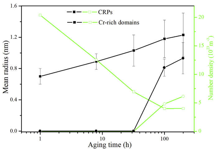 富Cu相与富Cr相的数量密度和等效半径的变化
