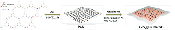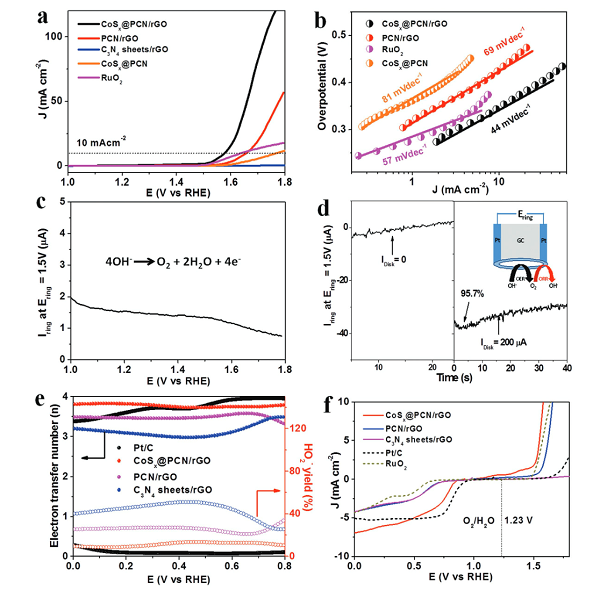 8月,中佛罗里达大学杨阳教授团队开发了一种兼具产氧(OER)与氧还原(ORR)催化活性的双功能钴硫掺杂的多孔氮化碳/石墨烯材料(CoSx@-PCN/rGO),成果发表于Advan ced Energy Materials。团队使用三聚氰胺为原料,经钴离子配合后,在空气中与氧气反应发生反应聚合形成钴掺杂的多孔氮/碳材料;之后,材料在氮气环境下与硫磺、氧化石墨烯作用,最终得到CoSx@-PCN/rGO材料。石墨烯的引入增强了材料的电子传输性能,而多孔碳结构增添了更多催化活性微店。最终,材料展现出优于商用铂、RuO2催化剂以及其他碳氮化物的催化活性与稳定性。同时,由此材料构成的锌-空气电极材料有着更优的充电性能。