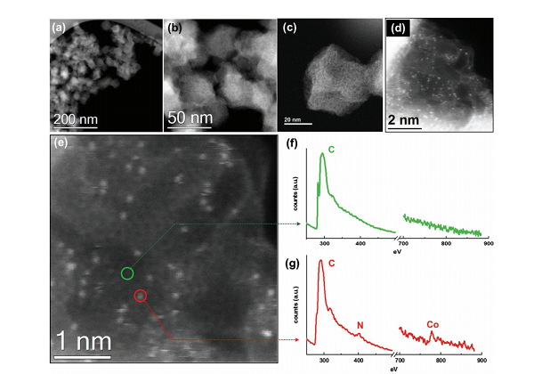 6月,中科院长春所邢巍课题组于Nano Energy报道了一种双原子中心型碳基催化剂。该工作利用金属有机框架作为前驱体,通过调节钴含量,精准制备了双原子中心钴催化剂。球差校正电镜和扩展的X-射线吸收近边谱证实了双原子Co中心活性位结构的存在。而双原子催化剂活性相比单原子提升一个数量级(13倍),应用前景得以改善。