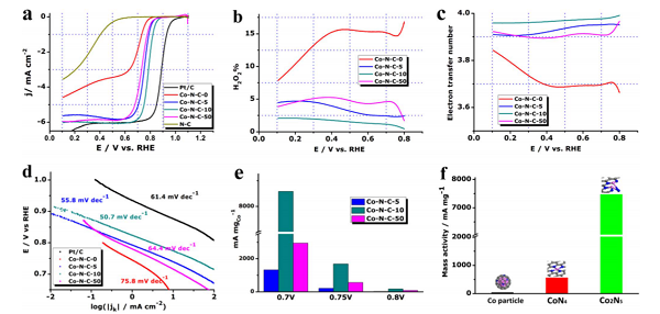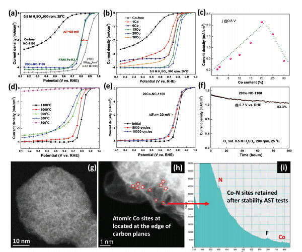 5月,纽约州立大学布法罗分校的武刚教授团队报道了一种氮配位的单原子钴碳基催化剂。铁的Fenton效应以及热处理过程中的团聚问题困扰了铁基金属-氮-碳材料制备与应用,电极中铁自由基、过氧化物的存在有可能导致有机质子交换膜降解。因此,无铂和无铁阴极催化剂是质子交换膜燃料电池(PEMFC)的重点研究方向。团队利用金属有机框架(MOFs)前驱体,经过一步热化学反应够造了一种含Co-N4活性位点的催化材料。像差校正电子显微技术结合X射线吸收光谱学实际上证实了Co-N4活性位点的存在。同时,均匀分散的活性位点大大增强了材料的催化活性。最终得到了性能与Fe-N/C材料、商用铂黑材料可比的钴催化材料。