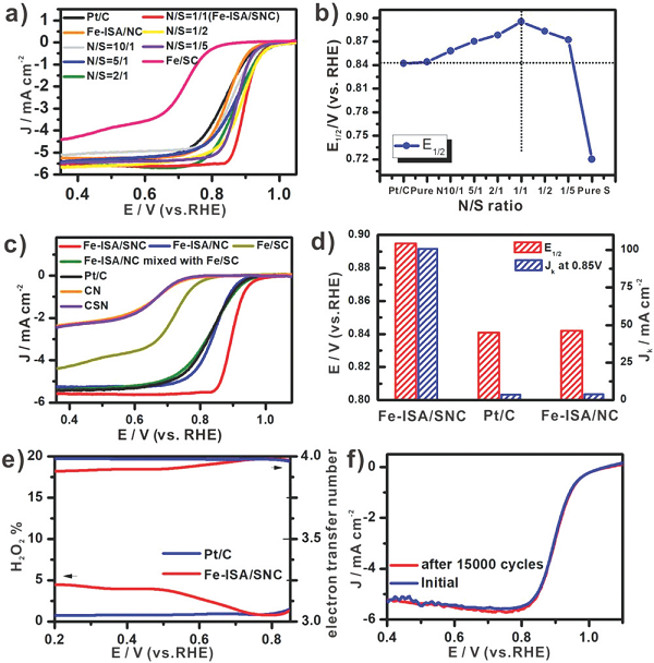 6月,清华大学李亚栋院士团队报道了一种硫和氮共掺碳(Fe-ISA/SNC)材料,成果发表于Advanced Materials。杂原子掺杂的Fe-NC催化剂是取代贵金属基催化剂的最有应用前景的催化剂之一。然而,对其结构参数的精细控制以优化催化效率和对催化机理的分子水平理解仍然是具有挑战性。团队创造性设计出一种新的吡咯-噻吩共聚物热解合成方案,在硫和氮共掺碳(Fe-ISA/SNC)上以可控的S,N掺杂方式合成Fe孤立的单原子位点。Fe-ISA/SNC的催化效率随硫掺杂量的增加呈火山型曲线变化。优化后的Fe-ISA/SNC半波电位为0.896V(vs RHE),相比铁氮共掺杂碳(Fe-ISA/NC,0.839V)、工业Pt/C(0.841V)和大多数其他铁单原子非贵金属催化剂有更高的半波电位。Fe-ISA/SNC有良好甲醇耐受性,经历15000扫描循环,在碱性条件下表现出可忽略的活性衰减。X射线吸收精细结构分析以及密度泛函理论计算表明,掺入的硫增加了环绕在铁原子周围的氮原子处电荷。富集的电荷促进了反应中间体OH*的还原释放,因此提高了总的ORR效率。