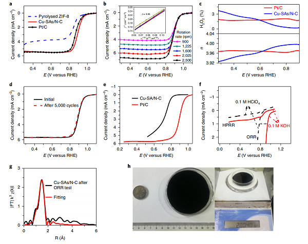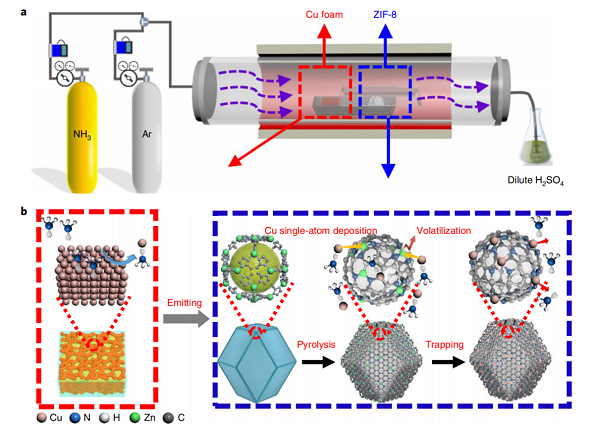 10月,李亚栋院士团队报道了一种具有大规模制备前景的碳基铜单原子分散催化剂。单原子催化剂因其在促进各种催化反应方面的高效性而颇受关注。然而,合成这些材料的常用方法通常需要繁琐的步骤,并且金属原子与载体之间缺乏适当的相互作用。团队创造性利用铜原子与氨气的路易斯酸碱相互作用,在氨气环境下将铜原子引入到MOF前驱体(ZIF-8)上,得到氮掺杂的单原子分散的铜催化剂,成果发表于Nature Catalysis。此工作实现了单原子分散催化剂的大尺度制备,同时材料展现出良好的氧还原催化活性,在5000次CV扫描后并未出现较大的电化学性能下降。
