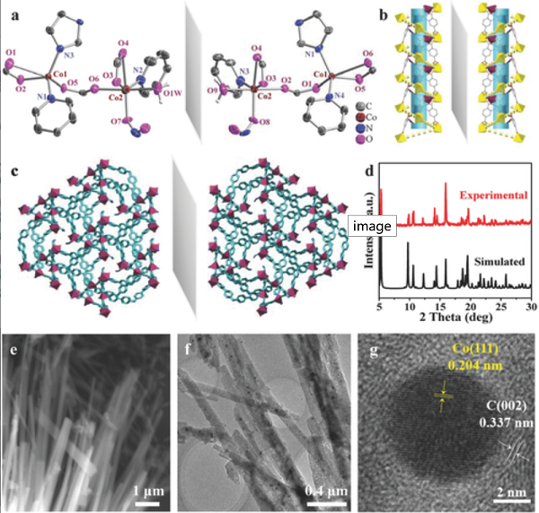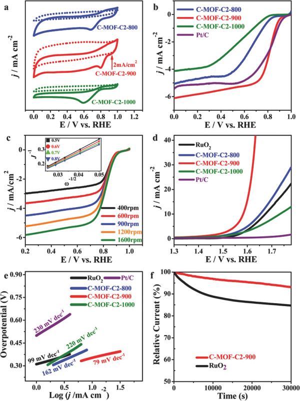 1月,凯斯西储大学戴黎明团队报道了一类新型钴掺杂的金属-氮-碳材料(C-MOF-C2-T),团队利用MOF作前驱体,对材料结构进行了精细设计,成果发表于Advanced Materials。新研制的C-MOF-C2-900具有独特的三维分级棒状结构,由沿棒长的部分石墨化氮掺杂碳环包覆的均匀分布的钴纳米颗粒组成。与钴相比,Co@N-C具有更高的氧还原和产氧反应的电催化活性(ORR和OER)。基于C-MOF-900的氧还原反应(ORR)初级锌空气电池,放电电位为1.30V,比容量为741mA h g(Zn)-1(10mA cm-2)。以C-MOF-C2-900为ORR和OER双功能催化剂的可充电锌-空气电池在展现出良好的初始充放电电位,且在120小时后仍具有优异的循环稳定性,且极化程度没有增加,优于基于贵金属空气电极。由此材料得到的可充电锌空气电池可以有效地为电化学水分离系统供电,展现出实际应用潜力。