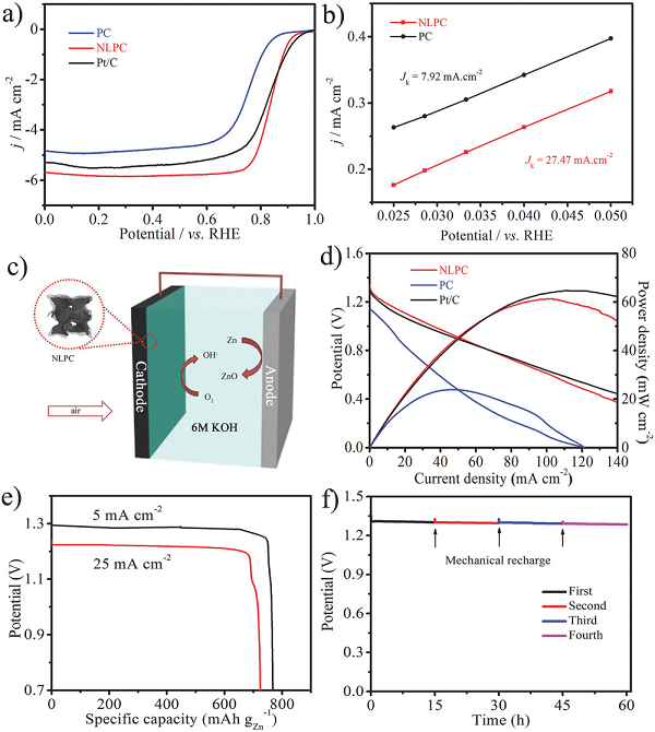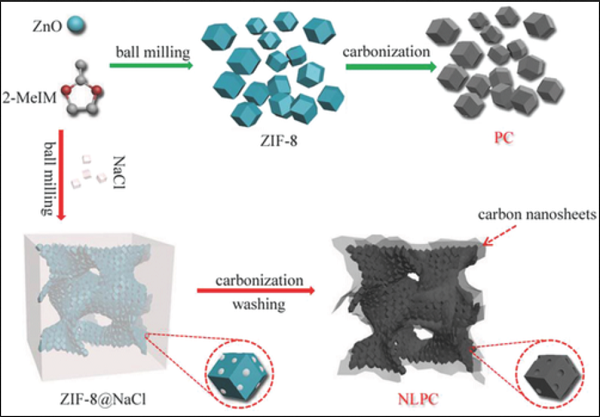 1月,湖南大学王双印课题组报道了一种利用富缺陷纳米片和多面体原位构建的三维氮掺杂的碳基电催化剂,成果发表于Advanced Functional Materials。团队通过金属有机骨架(MOF)的高温热解,在盐封反应器中原位连接碳多面体与纳米片,制备了三维碳电催化剂。MOF在向多面体的转化过程中,有机物被限制在盐封反应器中,部分分解并形成碳纳米片。原位形成的碳纳米片围绕着碳多面体形成三维碳网络。由于限制效应,MOFs在盐反应器中向碳网络的转化具有高产率,而活性碳没有显著损失,这增强了材料的电子和质量传输性能。所得材料缺陷丰富,这提供了更多电催化活性中心。材料展现处良好的ORR催化活性,甚至与Pt/C相当。由此构建的锌-空气电池也展现出良好性能。