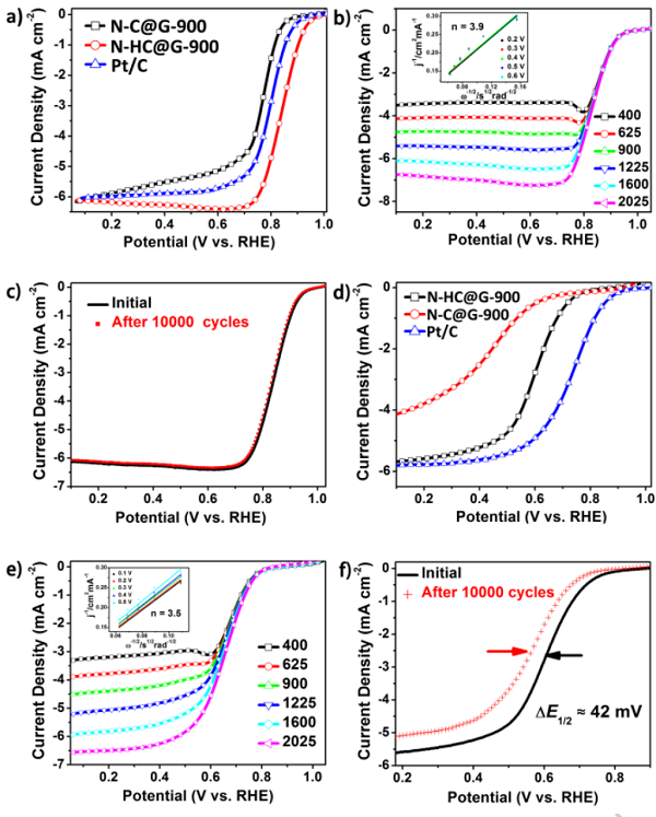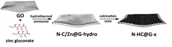 11月,中科院合肥物质科学研究所赵惠军教授与国家纳米科学中心唐智勇教授团队合作报道了一种超薄的石墨烯复合的氮掺杂多孔碳材料,成果发表于Angewandte Chemie。团队利用水热法将氧化石墨烯与葡萄糖酸锌在氨水的作用下复合,并经过高温热处理实现去除锌得到氮掺杂多孔碳材料(N-HC@G-x)。材料在碱性条件下展现出良好的性能与稳定性,在酸环境下经过多周期电化学扫描后性能仅略有下降。石墨烯增强了体系的电子传输能力,进而大幅提高多孔碳材料催化性能。值得一提的是,材料还展现出较好的产氧(OER)反应性能。