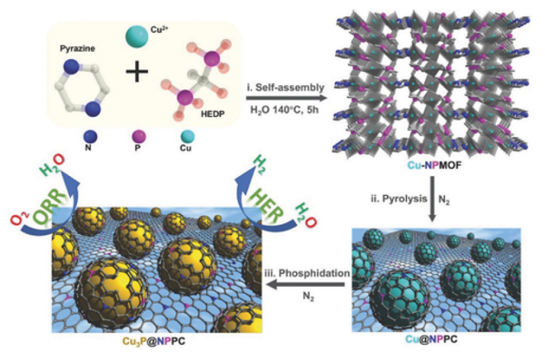 金属-有机骨架(MOF)是近年来发展起来的一种化学反应前驱体和高效的自牺牲模板,2月,郑州大学臧双全团队利用用于制备层状多孔碳纳米结构功能材料。团队以含氮杂原子和磷杂原子的铜基MOF(Cu-NPMOF)为前驱体,以Cu-NPMOF为模板,制备了N,P共掺杂碳壳包覆的新型Cu3P纳米粒子(NPs),进一步制备了氮磷双掺杂(Cu3P@NPPC)的多孔碳基电催化剂。Cu3P@NPPC具有高比表面积,同时得益于Cu3P NPs展现出协同效应,材料在氧还原反应中显示出优异的活性。