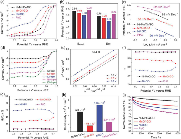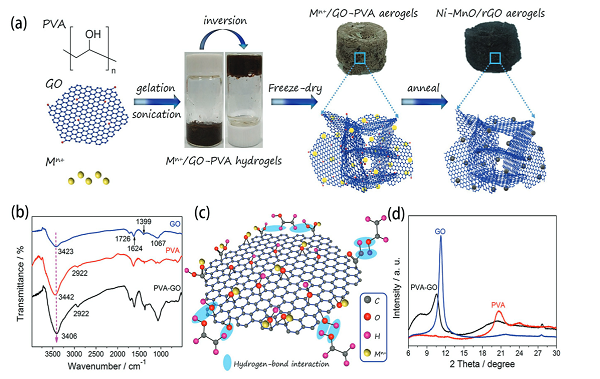 氧还原催化剂与析氧反应催化剂对金属-空气电池性能有重要影响。铂合金常用作氧还原催化剂,Ir/RuO2常用作析氧反应(OER)催化剂。2月,南京师范大学唐亚文团队通过简单易行的水凝胶法制备了三维多孔石墨烯气凝胶负载Ni/MnO(Ni-MnO/rGO气凝胶)双功能催化剂,成果发表于Advanced Materials。水凝胶允许在热解之后高效地捕获高活性的Ni/MnO颗粒。值得注意的是,所得到的Ni-MnO/rGO气凝胶在碱性电解质中对ORR和OER都表现出与贵金属催化剂可比的优异的双功能催化性能。MnO对ORR的高活性起主要作用,而金属Ni对OER的活性起主要作用。此外,这种双功能催化剂比混合Pt/C+RuO2催化剂具有更好的功率密度、比容量和循环稳定性,证明了其应用于可充电金属-空气电池的潜在可行性。