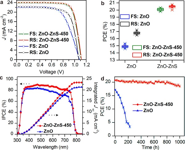 a) 基于ZnO和ZnO-ZnS-450的PSCs器件的最优J-V曲线图;