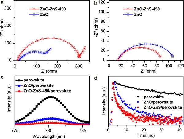 a) 在AM 1.5G照射和0 V偏压下,ZnO和ZnO-ZnS-450 器件的交流阻抗谱;
