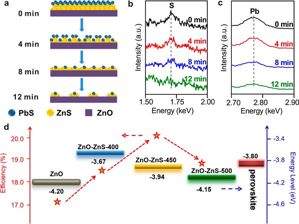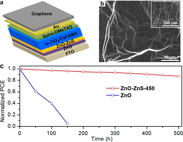 近日,厦门大学郑南峰教授、吴炳辉副教授(共同通讯作者)等报道了一种通过硫化将ZnO表面转化为ZnS的简单有效的策略,并用于钙钛矿太阳电池。并在J. Am. Chem. Soc.上发表了题为“High-Efficiency, Hysteresis-Less, UV-Stable Perovskite Solar Cells with Cascade ZnO−ZnS Electron Transport Layer”的研究论文。ZnO-ZnS表面上的ZnS与钙钛矿中的Pb2+离子具有较强的相互作用,形成了一个新颖的电子传输通道,加快界面电荷转移;而且ZnS作为界面钝化层,能够减少界面电荷复合几率,同时避免了ZnO和钙钛矿直接接触,进而增强器件的稳定性。基于相关发现,组装的器件效率可达20.7 %,且低回滞;在储存放置1000 h后,器件仍保持其初始效率的88 %。并进一步利用石墨烯材料对电池进行封装,相应的电池可同时在70 %的高湿度和紫外光照射的条件下,稳定工作超过500小时。