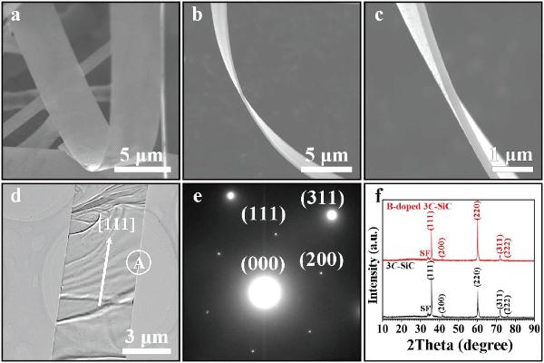 近日,宁波工程学院杨为佑教授、北京HTH官网地址 大学侯新梅教授、复旦大学方晓生教授(共同通讯作者)等采用有机前驱体热解工艺,合成了B掺杂3C-SiC纳米带,实现了以3C-SiC纳米带光电探测器(PD)的研发,相关成果在Adv. Funct. Mater.上发表了题为“High-Performance SiC Nanobelt Photodetectors with Long-Term Stability Against 300 °C up to 180 Days”的研究论文。该PD在405 nm光激发下,具有6.37×105 A·W-1的响应度和2.0×108%的外量子效率,探测率为6.86×1014 Jones。此外,B掺杂3C-SiC纳米带PD在300℃高温下180天内,展现出良好的长效稳定性。