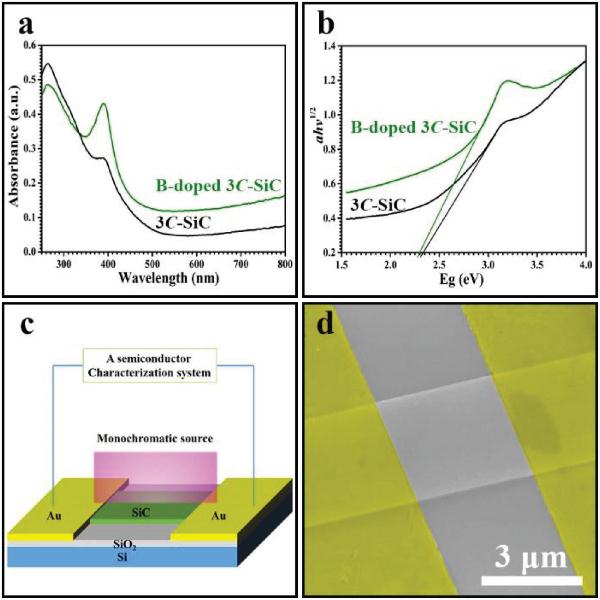 a) 5.0 V偏压、波长范围为250-700 nm时,0.31 mol% B掺杂单根SiC纳米带PD的光响应;