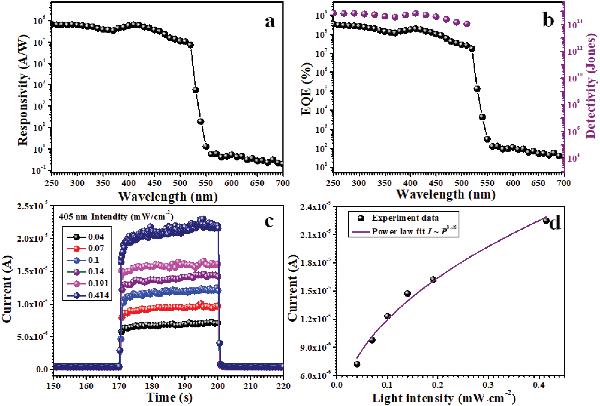 d) 在入射光波长405 nm下光电流随光强的变化。