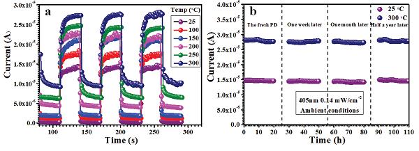 a) 在5.0 V偏压、405 nm光照下,B掺杂SiC纳米带PD在25-300 ℃不同温度下的光响应曲线;