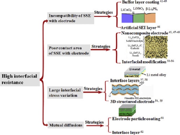 电解质和电极之间的高界面电阻对电池的整体性能具有显著的影响,阻碍了ASSLBs发展。ASSLBs的电化学反应不同于使用具有固—液界面的液体电解质的锂电池,其通过固、固电解质—电极界面进行。锂离子是通过它们的互连区域从电解质扩散到电极,并在接触电解质-电极界面处发生与活性材料和电子的氧化还原反应。