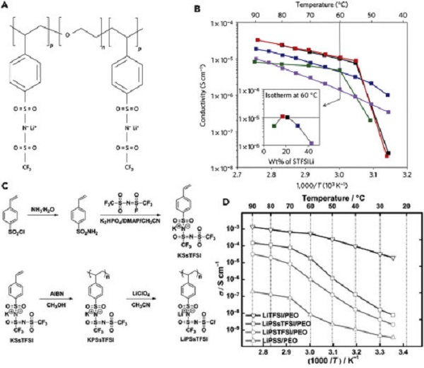(C) 单锂离子导体LiPSsTFSI聚合物的合成路线;
