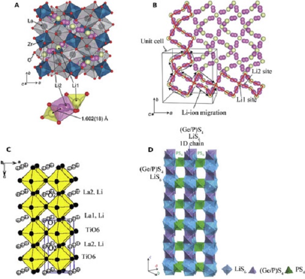 石榴石型材料的通式为A3B2(XO4)3(A = Ca, Mg, Y, La或稀土;B = Al, Fe, Ga, Ge, Mn, Ni, V;X = Si, Ge, Al),其中A和B阳离子分别具有8和6配位。钙钛矿结构的理想通式为ABO3(A = Li, La;B = Ti),其中A位点为12配位,B位点为6倍配位。NASICON型结构的结晶磷酸盐如Li1+xAlxTi2-x(PO4)3(LATP)和Li1+xAlxGe2-x(PO4)3(LAGP)具有高离子电导率,优良的锂离子导体在室温下的导电率~7×10-4 S cm-1,在潮湿的环境中具有良好的稳定性。