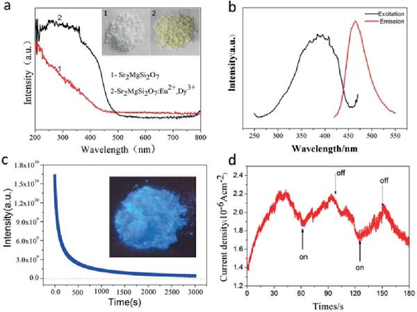 d) 300 W Xe灯照射下Sr2MgSi2O7:Eu2+,Dy3+的光电流密度。