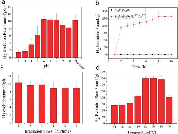 d) 紫外光照射后Sr2MgSi2O7:Eu2+,Dy3+在黑暗中不同温度下的制氢性能。