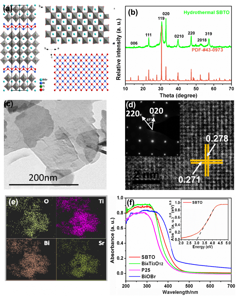 中国地质大学(北京)材料科学与工程学院资源综合利用与环境能源新材料创新团队张以河教授、黄洪伟教授与纽卡索大学马天翼博士指导博士生涂姝臣,近期在Nano Energy上发表了题为Ferroelectric Polarization Promoted Bulk Charge Separation for Highly Efficient CO2 Photoreduction of SrBi4Ti4O15的文章。文中选择同时具有光响应和铁电性的层状铋系半导体SrBi4Ti4O15为研究对象,首次通过水热法合成了[001]晶面优势暴露且沿[100]极化方向定向生长的SrBi4Ti4O15纳米片,由于铁电极化沿[100]方向累积形成强的宏观极化电场,从而使其在光催化过程中的具有更高效的体相电荷分离效率,最终大幅提升SrBi4Ti4O15在光催化下的CO2还原性能。