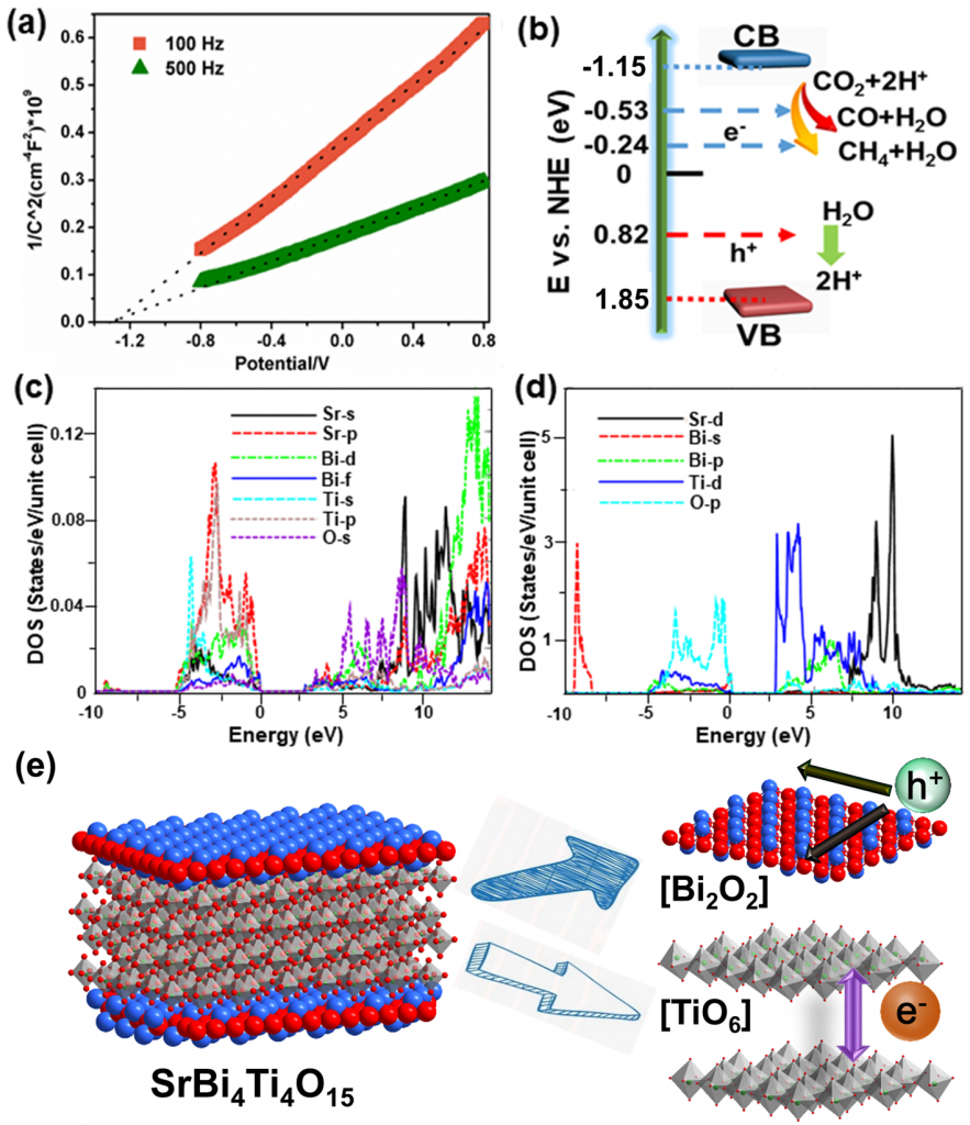 (c、d)SrBi4Ti4O15态密度计算及(e)电子空穴分离与迁移示意图。