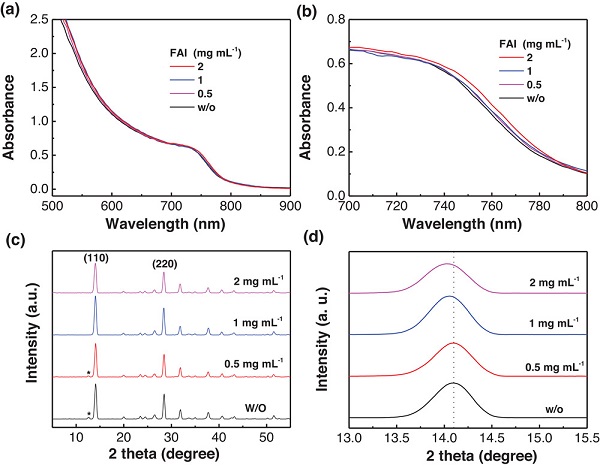 图三:不同FAI浓度处理前后MAPbI3薄膜的UV-vis吸收光谱和XRD图