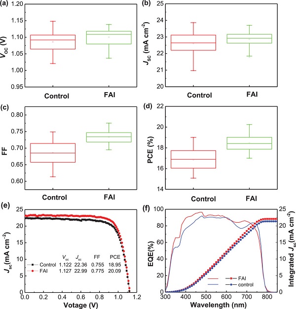(a-d) 对照组与FAI处理组太阳能电池的VOC, JSC , FF and PCE统计学分布,从100个太阳能电池收集的数据(每种类型50个太阳能电池);