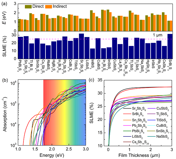 (a)理论设计的潜在性能优异半导体材料的带隙及材料在1µm厚度时的最高光电转换效率(spectroscopic limited maximum efficiency,SLME)。(b,c)SLME>25(1µm厚度)的13种材料的光吸收谱和SLME随厚度的变化。筛选设计出的材料均具有高吸收系数,其中CuBiS2,CuSbS2和NaSbS2已被实验报导,呈现出不错的光电转换性质。Sr3Sb4S9和SrBi2S4的理论最高光电转换效率高达30%,值得进一步实验和理论研究。在理论优化设计的材料中,Sn-Sb-S体系被实验合作者合成;通过连续离子层吸附反应后在氮气中退火,制备纳米级材料SnxSbyS(x≈0.38,y≈0.28),实验测得的光学带隙值与计算值基本吻合,并呈现出>5%的太阳能电池器件效率。