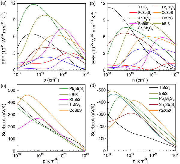 理论设计的潜在性能优异半导体材料中,带隙小于1 eV的材料有潜力作为热电材料。用电子拟合函数EFF进行进一步的筛选优化:(a,b)电子拟合函数EFF随n型和p型载流子浓度的变化关系;(c,d)从(a,b)中分别选出n型和p型掺杂条件下的EFF值较大的5个材料,计算Seebeck系数。结果发现筛选设计出的材料的Seebeck系数在250µV/K至400µV/K,与已知的性能优异热电材料可比拟。筛选出的材料中,AgBi3S5,FeSbS和CoSbS是实验已报导、具有优异热电性能的材料。