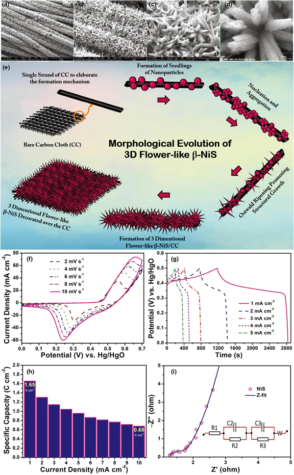 (e)3D花状β-NiS纳米结构的合成示意图;