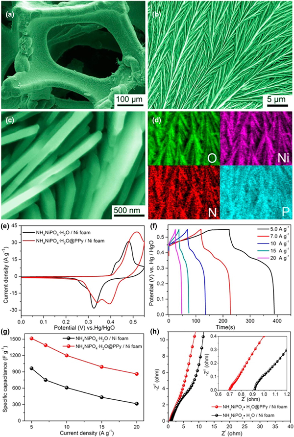 (h)NH4NiPO4·H2O/Ni泡沫和NH4NiPO4·H2O@PPy/Ni的EIS图(插图:高频区域的放大图)。