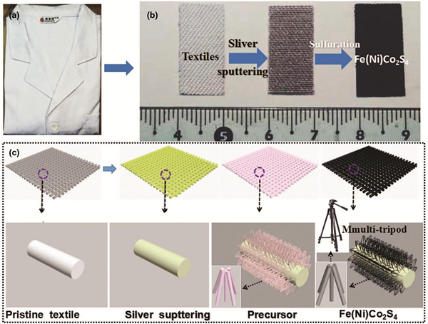 (c)FeCo2S4-NiCo2S4在银溅射纺织布上的制备过程的示意图。