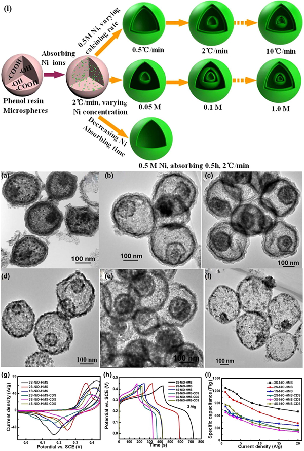 (d-f)双壳、三壳和单壳NiO空心微球的TEM图像;