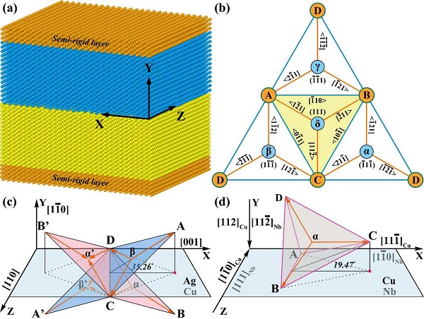 金属基纳米复合材料由于其优异的性能而备受关注和广泛研究,比如,优异的抗辐射损伤性能,良好的热稳定性,以及在常温和室温条件下的较高强度和塑性阻力。这些性能上的显著增强可以归因于双金属界面在高温、辐射和机械变形条件下表现出的特定界面结构稳定性。研究表明,诸多关键的力学行为,例如位错形核、缺陷的吸收和湮灭,都起源于界面区域。虽然低能双金属平界面结构在材料中普遍存在,但也有可能通过宏观的或局域的晶体学取向改变而形成高能界面结构。虽然这些高能界面出现的频率可能较低,但它们仍然是缺陷形成和相间运动的优先位置,在材料变形响应中发挥重要作用。