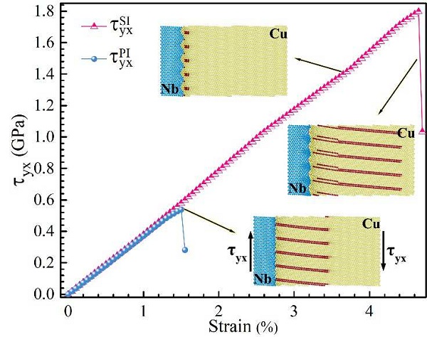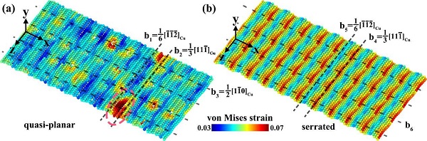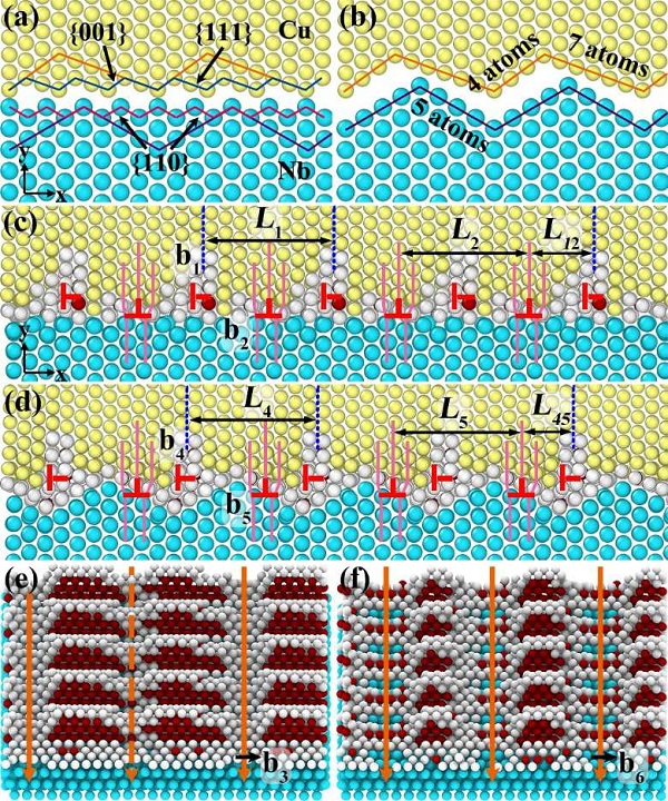 3. 锯齿状Cu{112}//{112}Nb界面沿着锯齿交替分布的方向具有更高的剪切阻力,同时阻碍了具有面外伯格斯矢量的错配位错开动;