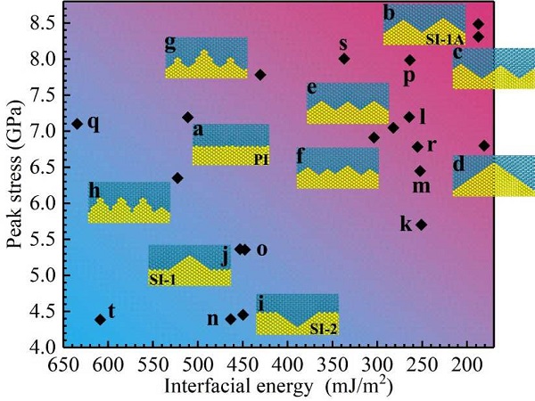 图十一:具有不同锯齿配置的各种Cu{110}//{110}Ag界面的界面能和峰值拉伸应力
