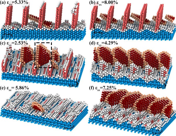 2. 与平坦界面或准平面界面相比,锯齿状界面在单轴拉伸/压缩载荷下实现更高的峰值应力和临界应变,这意味着更高的位错成核势垒。界面结构和错配位错的重新配置改变了优选的滑移系统和变形机制,并减轻了界面处的应变集中;